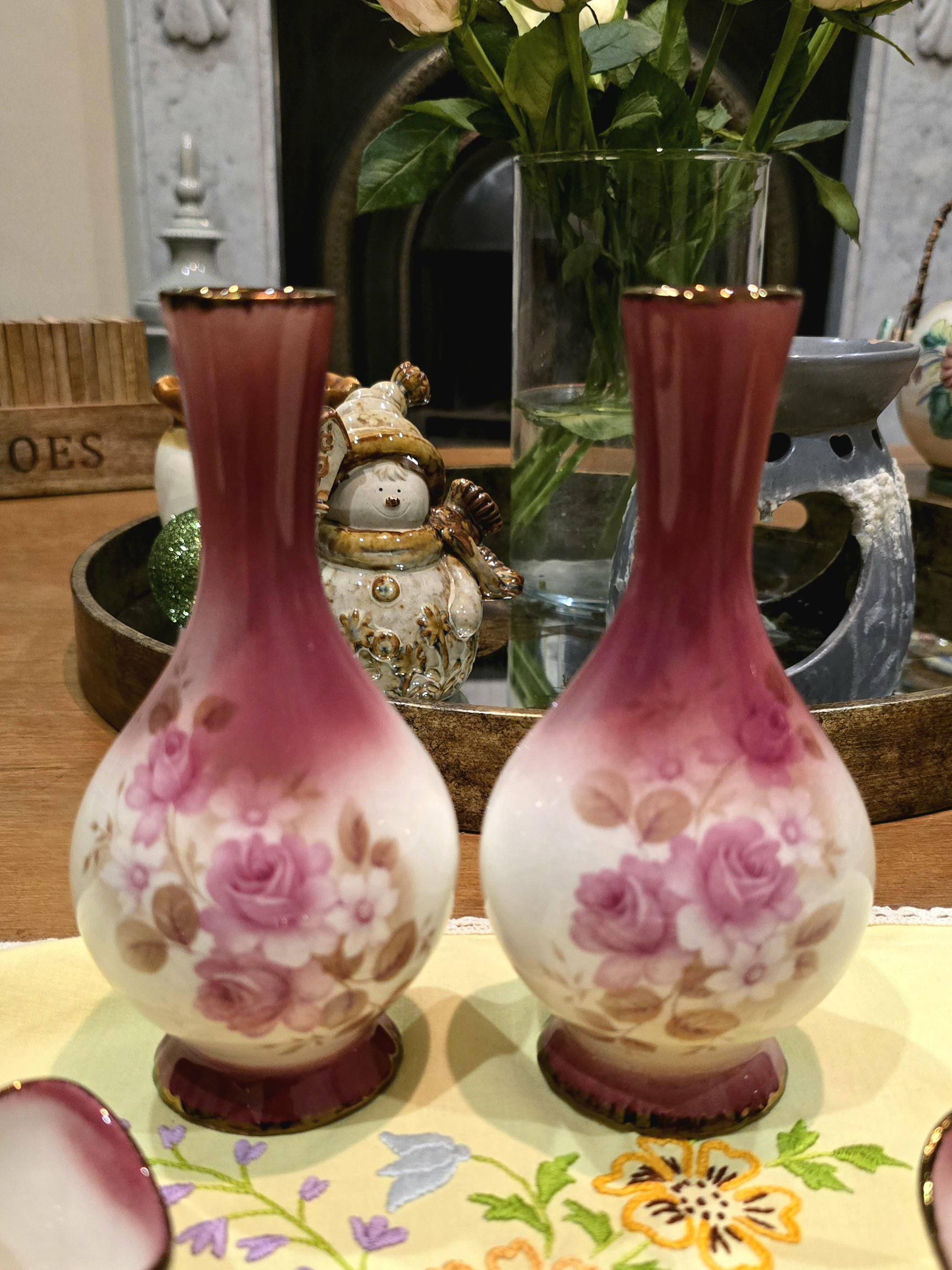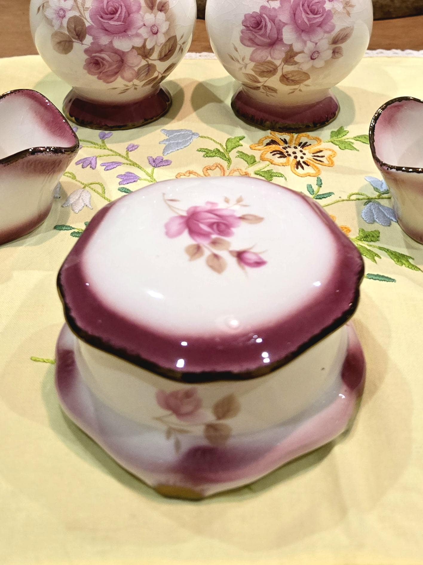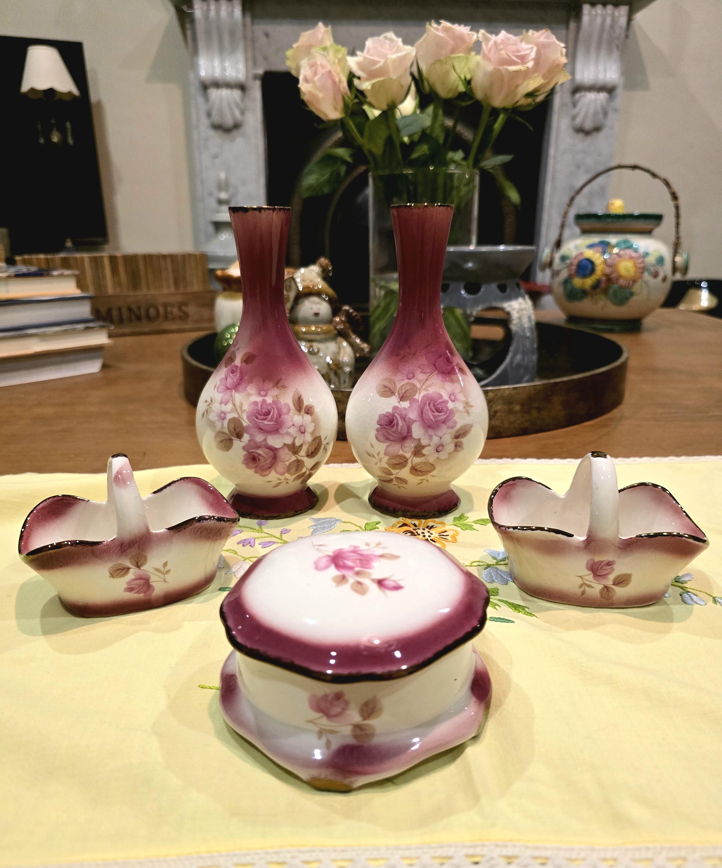 This is a stunning 5-piece vintage vanity set by the renowned Mayfayre Staffordshire Pottery. Made in the heart of England, this suite perfectly captures the romantic "English Rose" aesthetic with its delicate floral sprays and luxurious magenta-to-cream gradient.